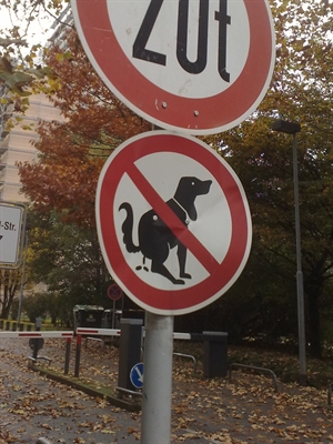 تابلو های راهنمایی و رانندگی عموما بین المللی هستند و زمان و مکان نمی شناسند. اما خوب، کاربرد این تابلو ها در کشور های مختلف ممکن است کمتر یا بیشتر باشد. یک از تابلو هایی که در کشور ما و مخصوصا جلو مراکز درمانی و بیمارستان ها زیاد به چشم می خورد، تابلو (لطفا بوق نزنید) است ولی شاید برایتان جالب باشید بدانید در آلمان چنین تابلویی وجود ندارد، چون مردم آلمان اصولا اهل استفاده از بوق نیستند. شاید باور نکنید که درقریب یکسالی که من در آلمان اقامت دارم تعداد بو ق های اتومبیلی که شنیده ام از تعداد انگشتان دو دست تجاوز نکرده است. تعدد چراغ های راهنمایی و سرعت گیر های متعدد (البته نه به سبک سرعت گیر های ایران بلکه سرعت گیر های افقی که بعدا در باره آن خواهم نوشت) و محدودیت سرعت در معابر شهری باعث شده مردم آلمان بسیار خونسرد و آرام رانندگی کنند. در مقابل تابلوهایی اینجا هست که در کشور ما کاربرد ندارد. در سرزمینی که همنشین و همدم اکثر مردم آن حیوانات و مخصوصا سگ ها می باشند در نقاط مختلف، مخصوصا در فضاهای سبز و محوطه آپارتمان ها به تابلو زیر برخورد خواهید کرد که (البته با عرض معذرت): حیوانات گرامی لطفا در این مکان ....!